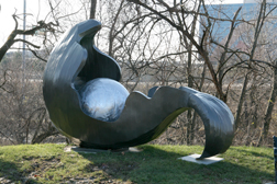 (left) The third sculpture of four to be installed in Harrison Park settled on the Olentangy riverbank on November 30, 2011. The one-ton Brassia Orchid, designed by Hannah Mason-Macklin and fabricated by Steve Bush, is powder-coated a bronze similar to the park’s gazebo. A stainless steel ball rests in the heart of the cradle-like orchid.